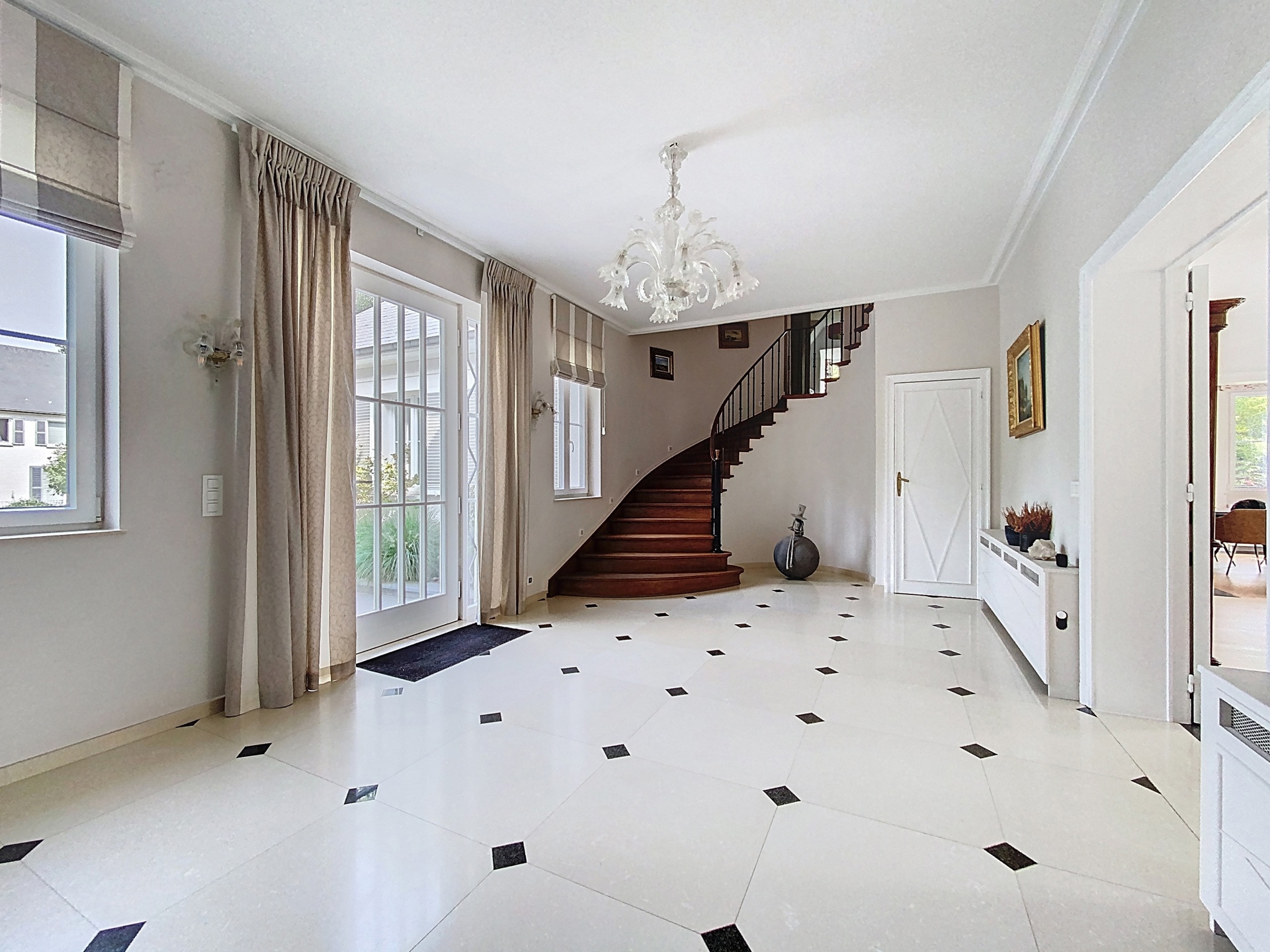 Large entrance hall 27 m², marble with cabochon inlays, oak staircase to upper floor
