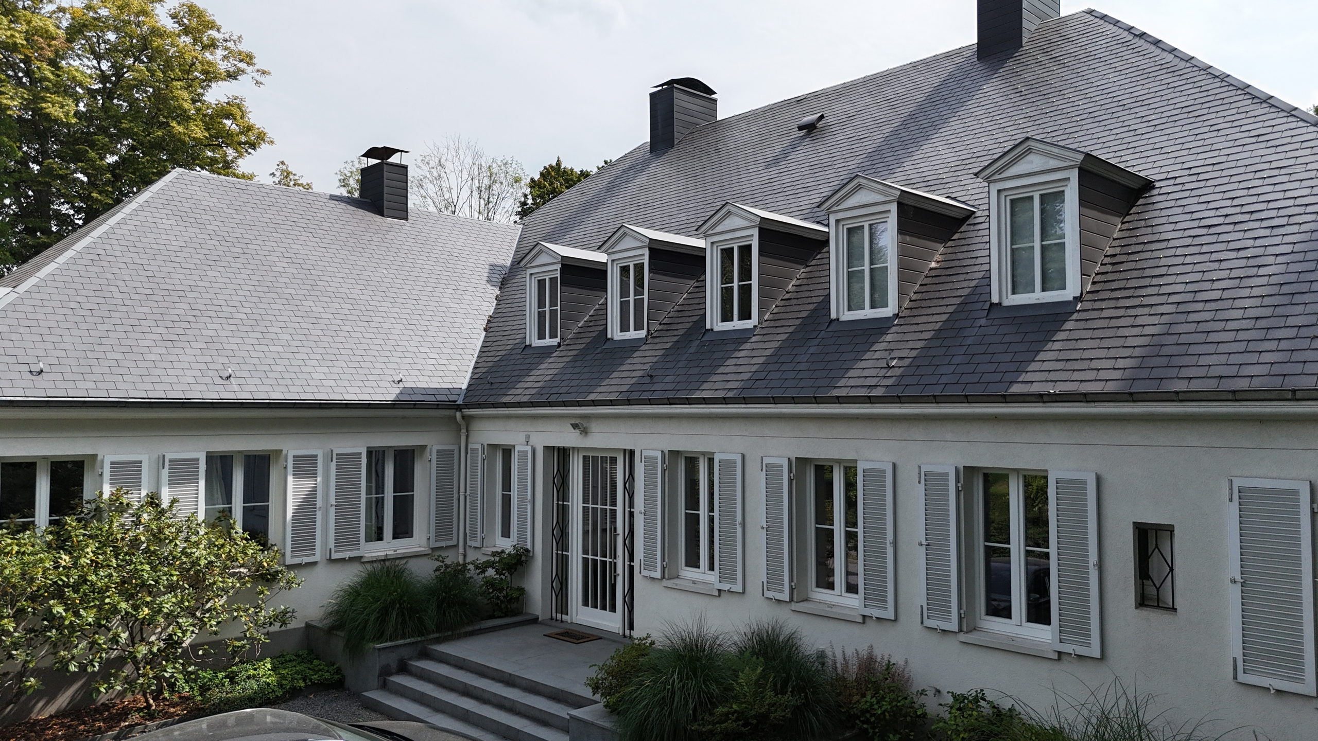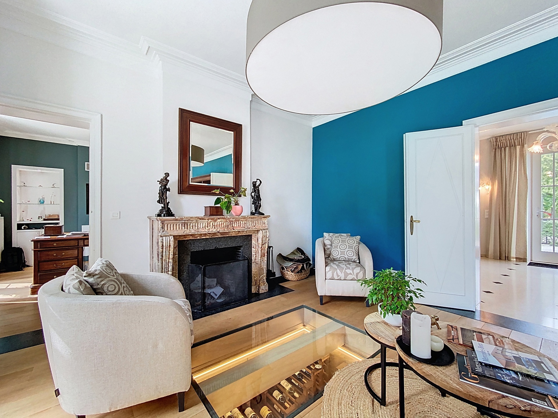 → Living room 8m22/4m44 = 36.5 m², 3 double windows opening onto terrace, open fire, view of illuminated “design” wine cellar in basement