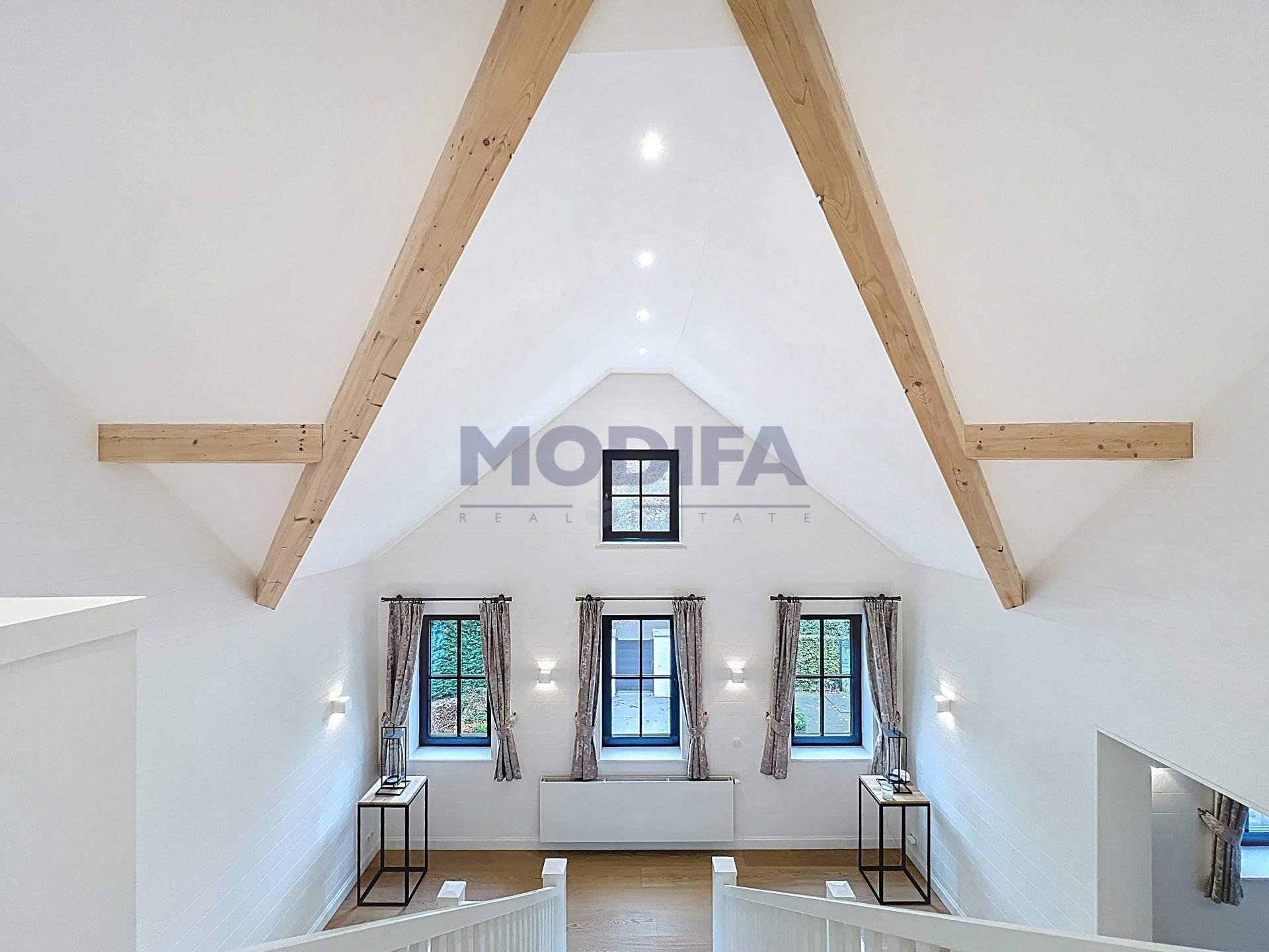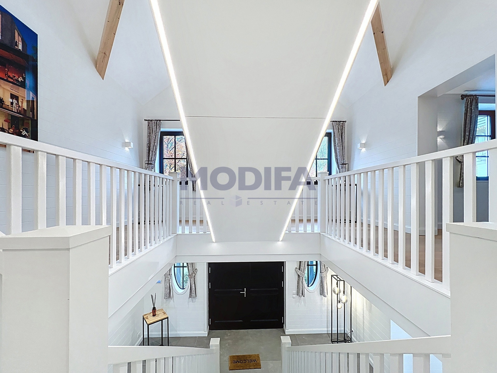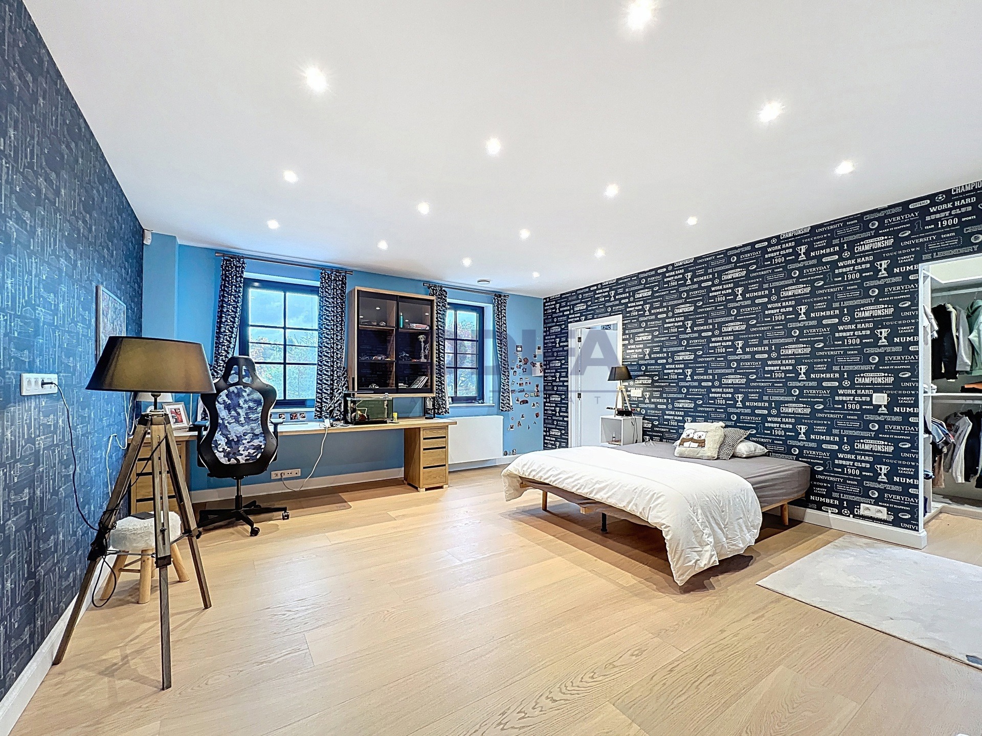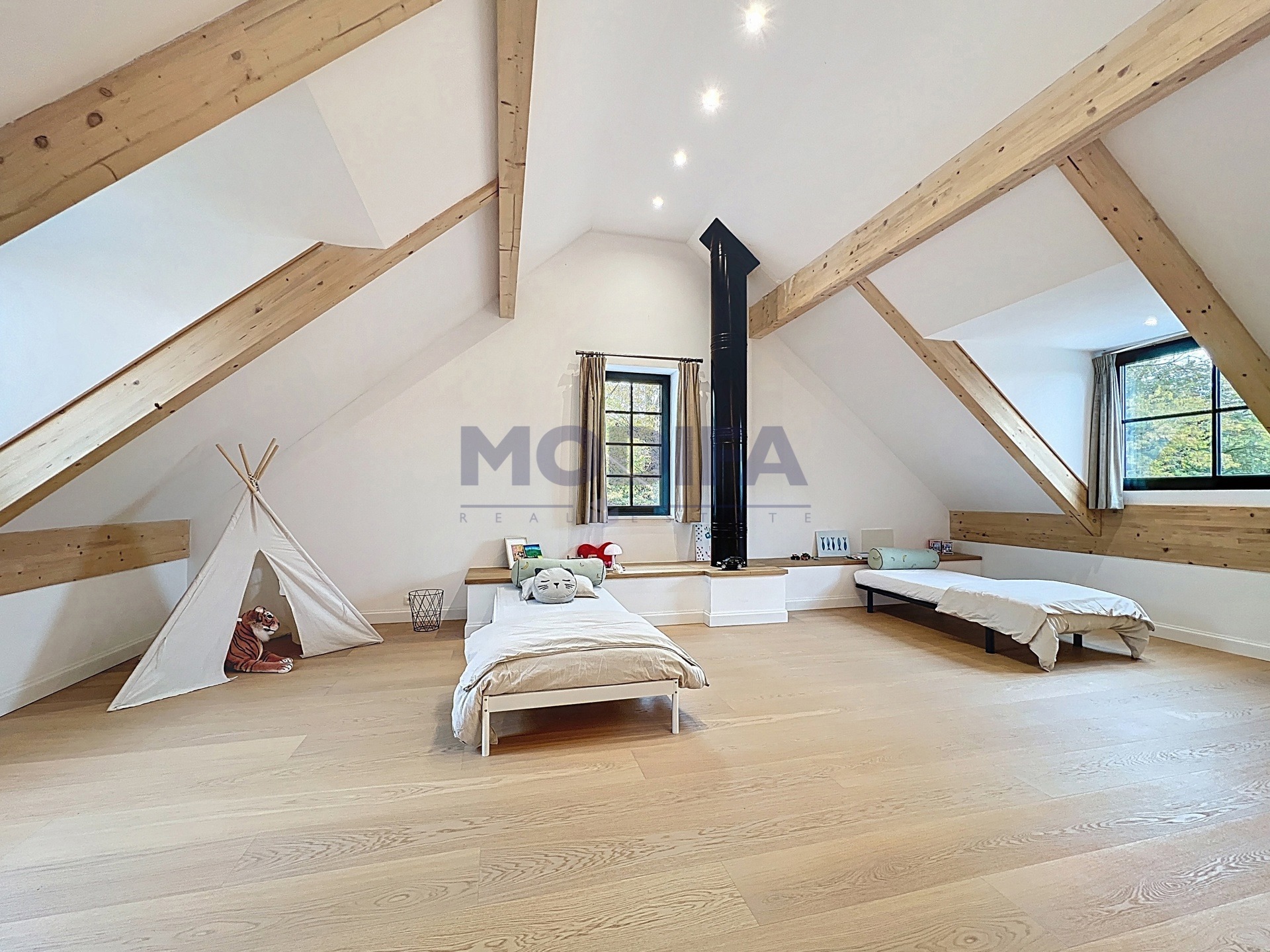 Bright living room with open kitchen, study with wine cellar; upstairs, 5 bedrooms, 4 of them en suite.