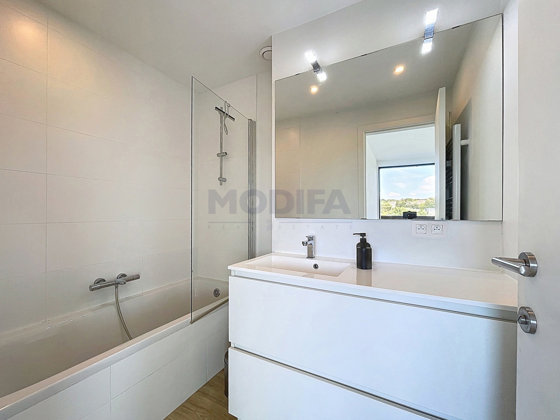A l'étage, pièce polyvalente (TV-room / bureau / 3ème chambre) avec vue imprenable et double porte-fenêtre donnant sur une 50m² de terrasse orientée Sud/Ouest, deuxième chambre avec grand dressing attenant et salle de bains. À cet étage se trouvent également une toilette séparée et un espace de rangement.