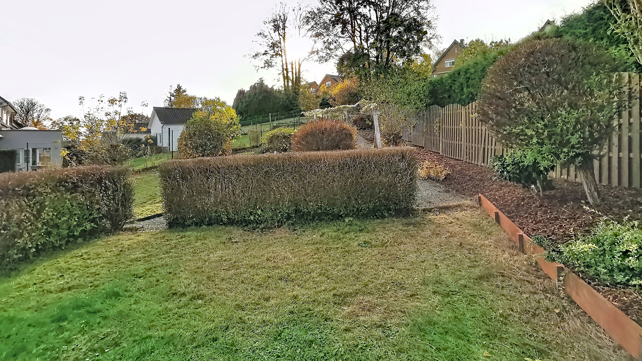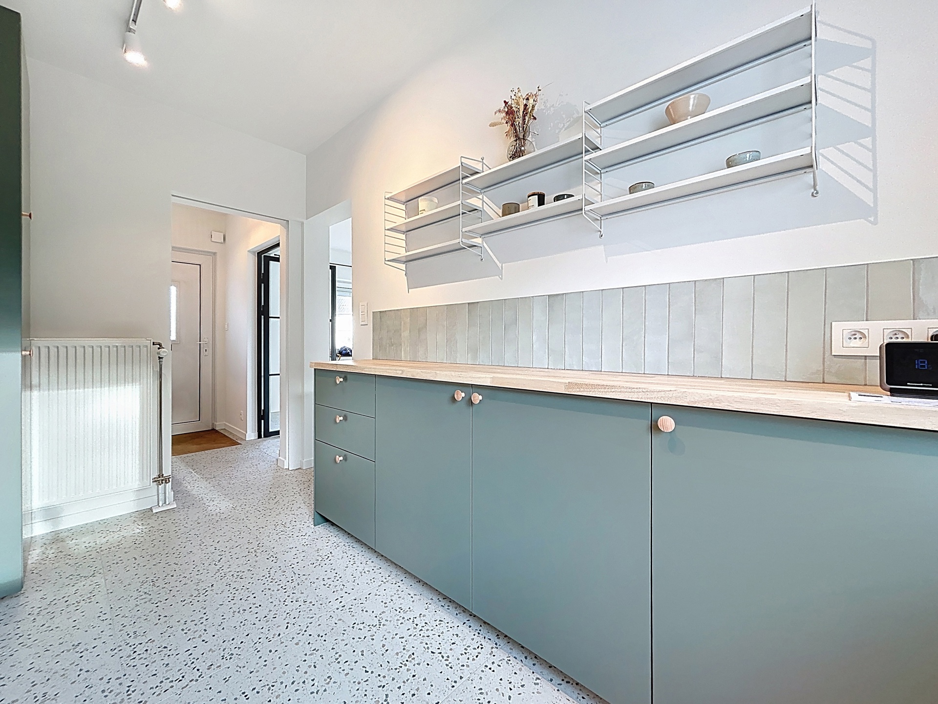 Cuisine (9,69 m²) : entièrement équipée (four, micro-ondes, réfrigérateur, taques électriques, lave-vaisselle, hotte, etc.). Une porte donne directement accès au jardin.
