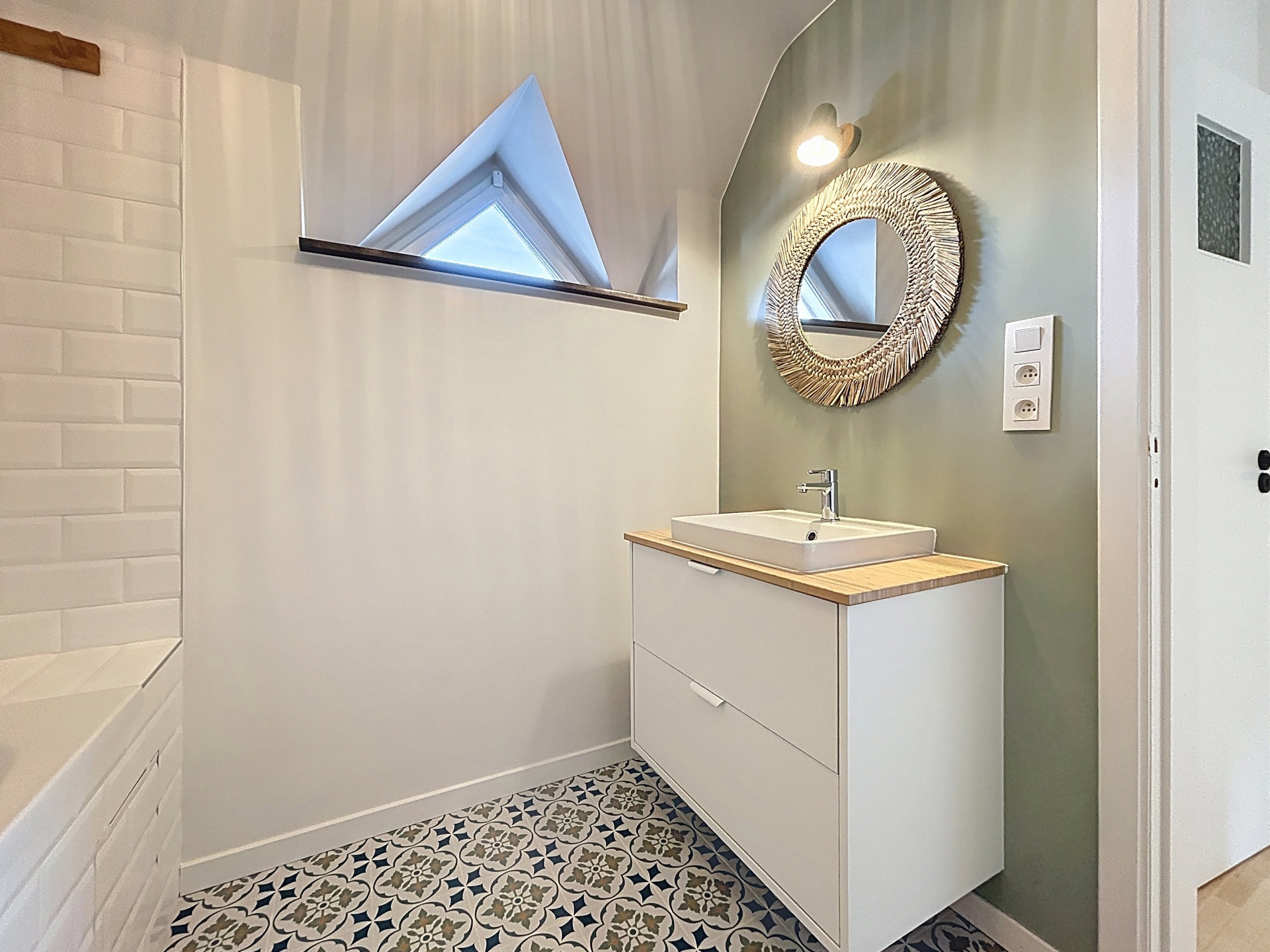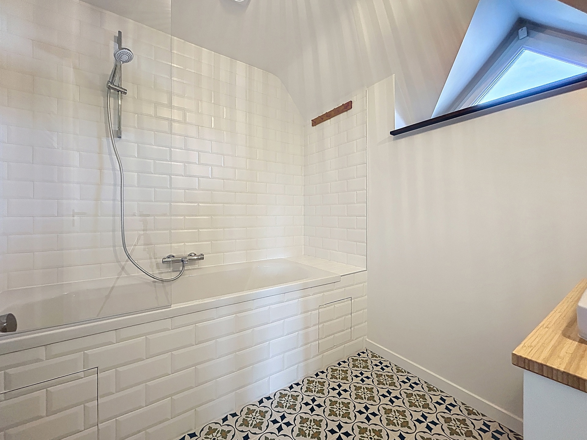 Salle de bain (4,96 m²) : équipée d’une baignoire avec paroi de douche pour éviter les éclaboussures. Le sol est en carrelage motif mandala.
