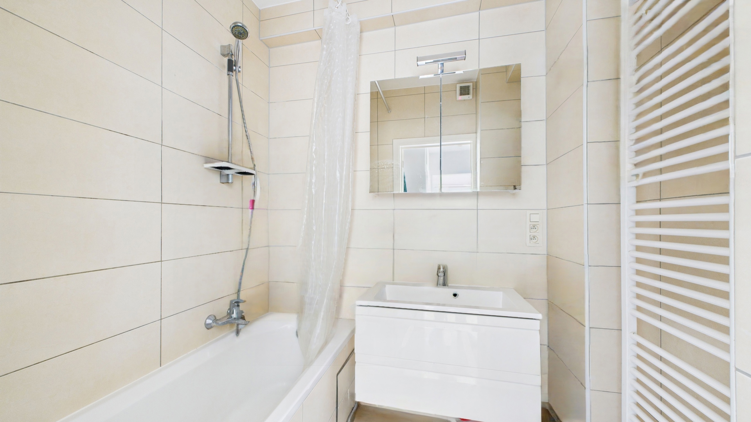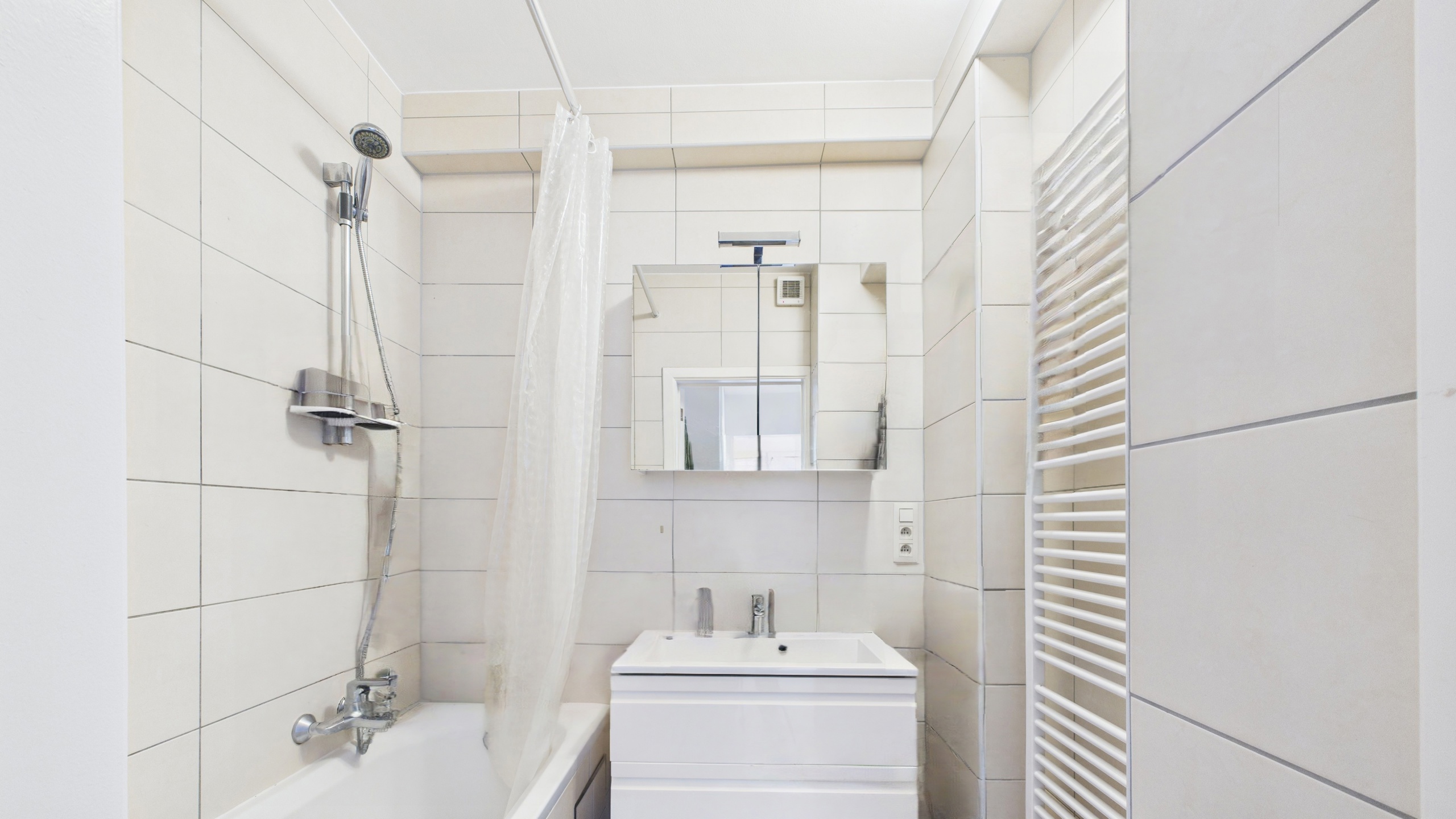 Salle de bains ( bain, vasque avec meuble et miroir,radiateur)