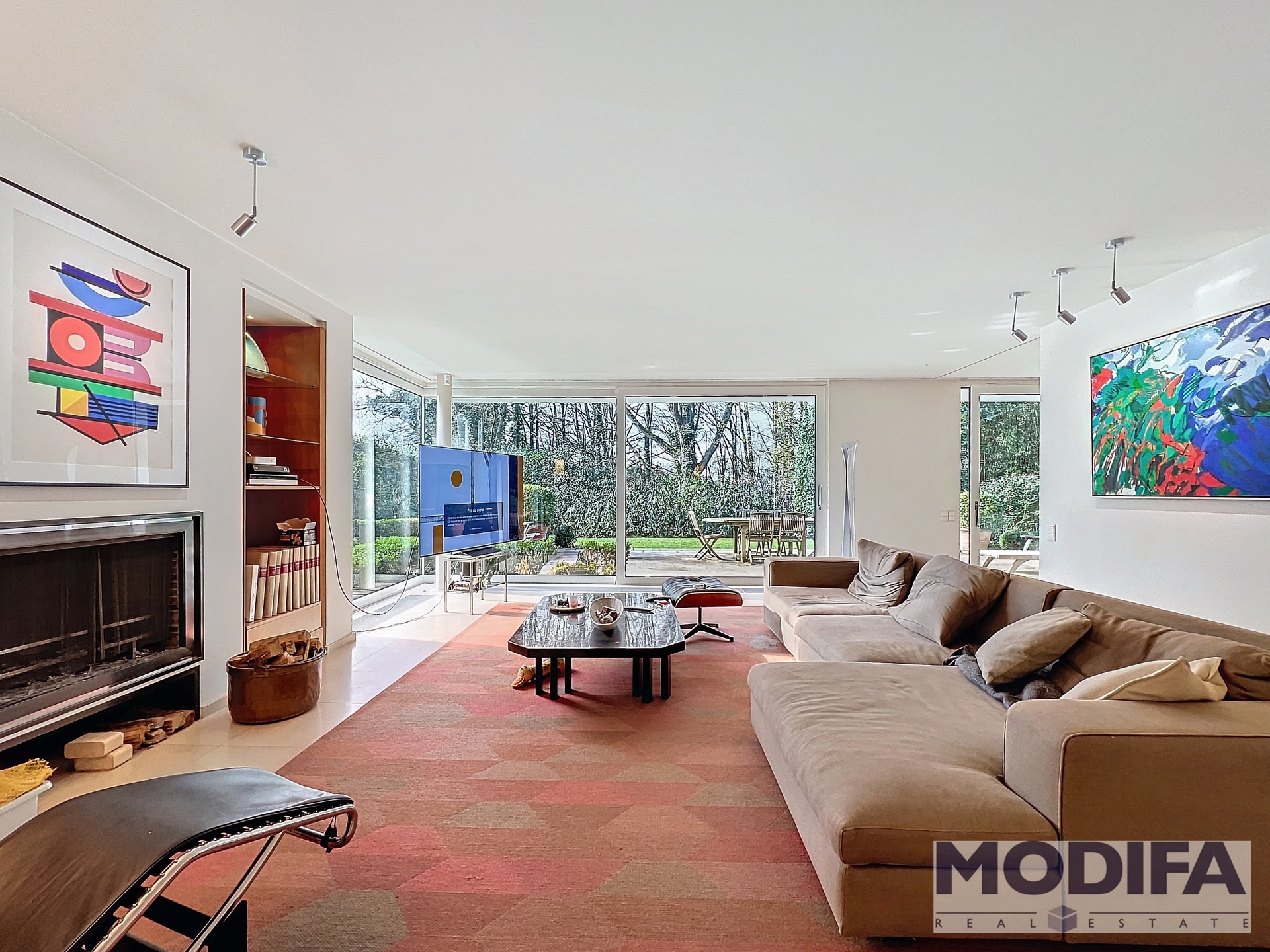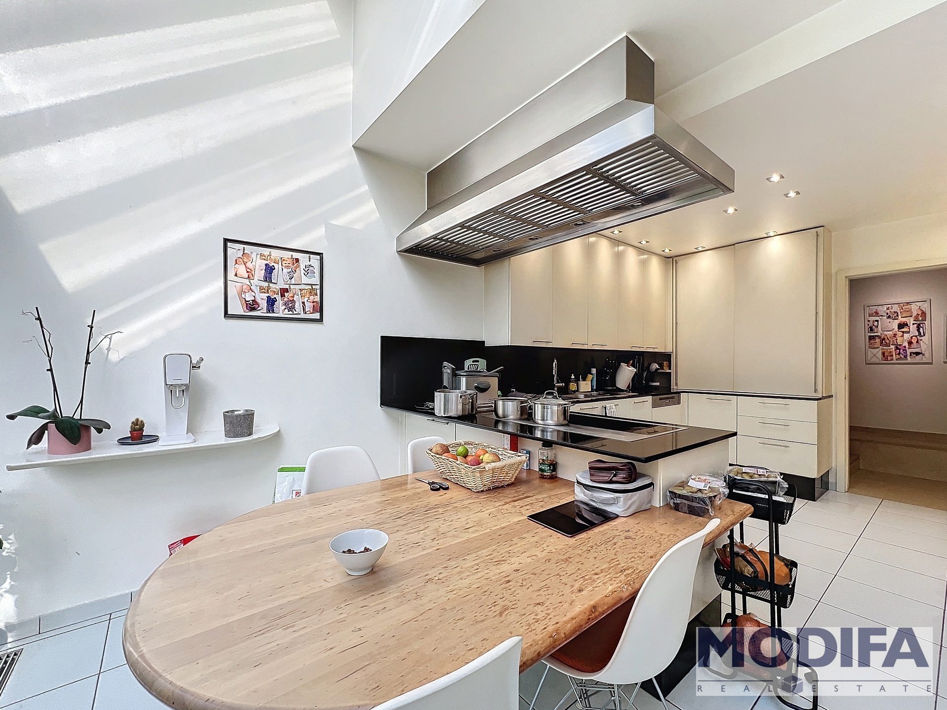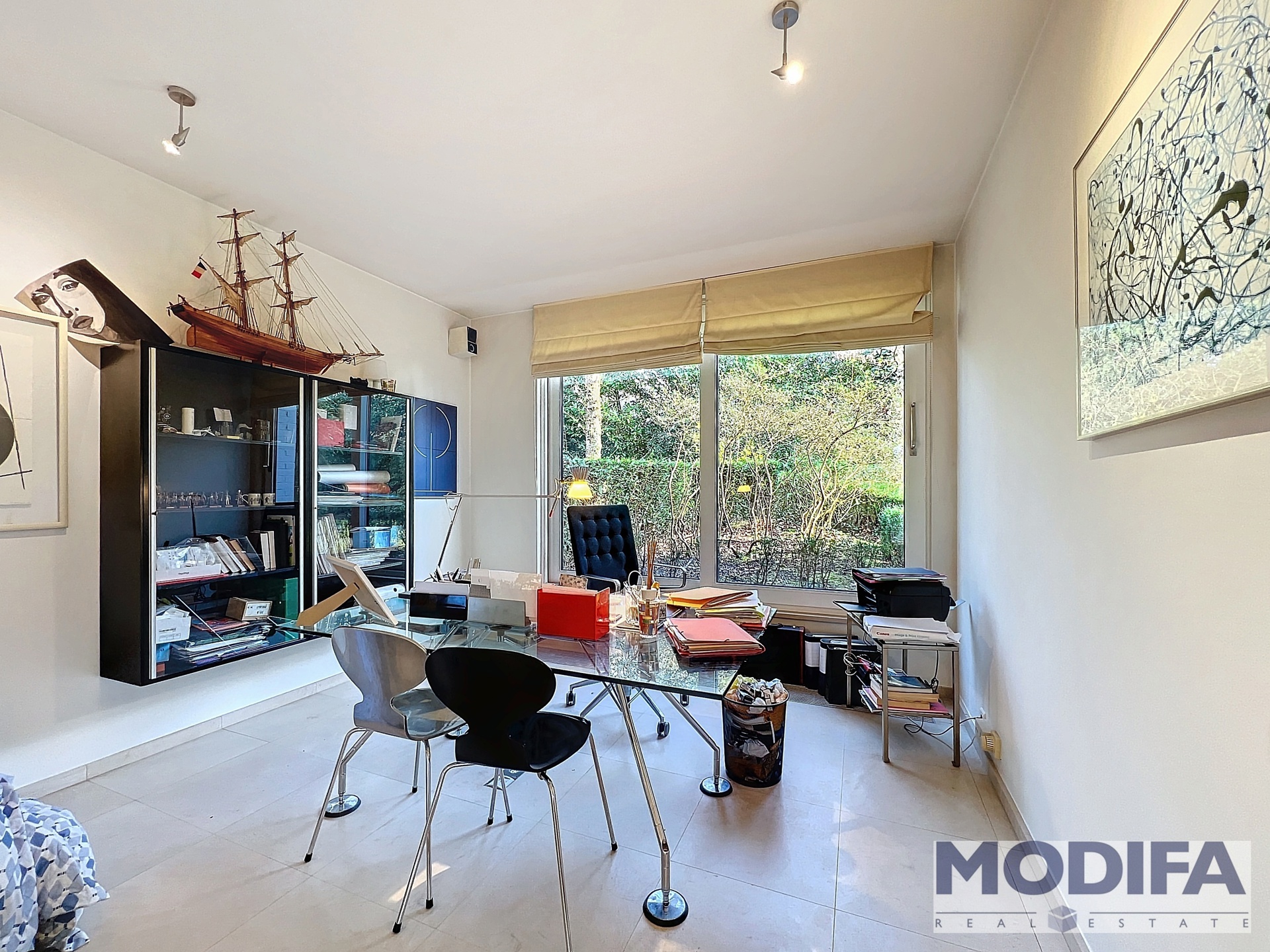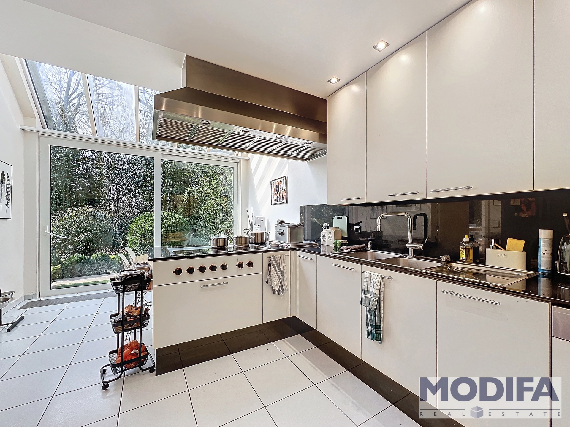 Large hall d'entrée vers confortable séjour en trois parties avec portes coulissantes, cuisine récente hyper-équipée (Granit, électro-ménagers Gaggenau, nombreuses armoires, coin-à-déjeûner), bureau séparé au rez.