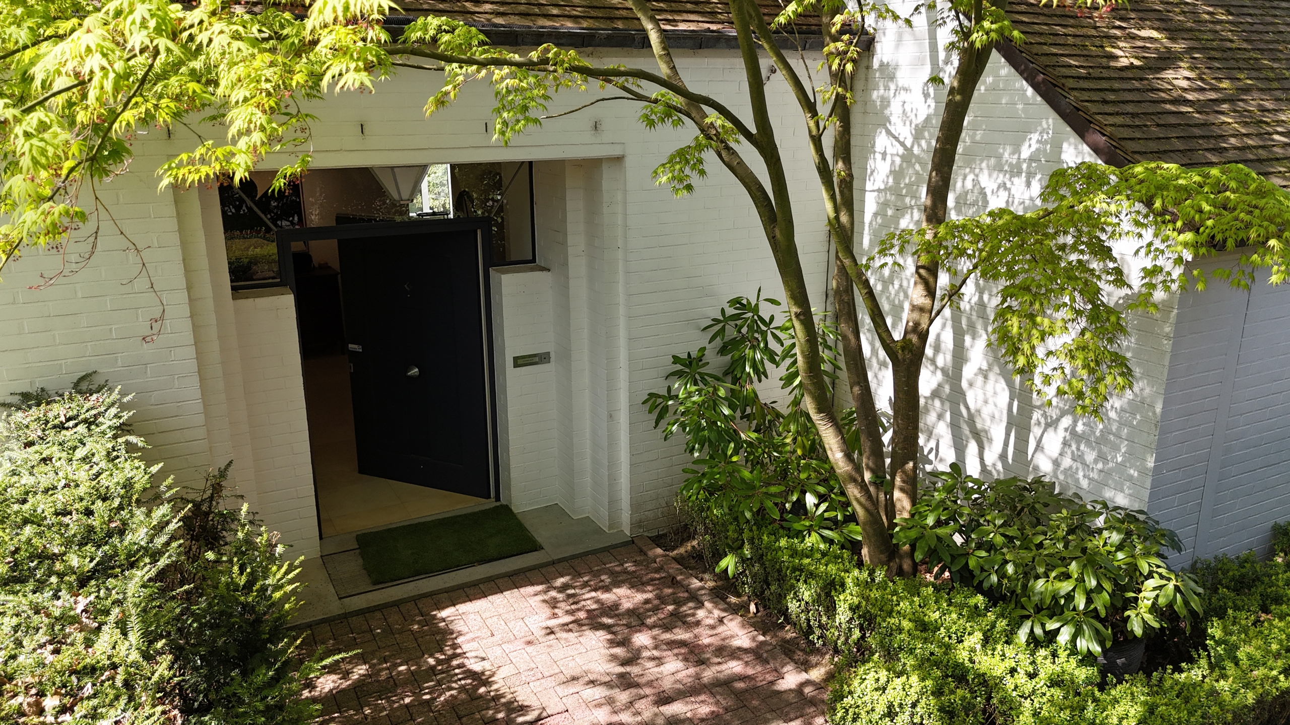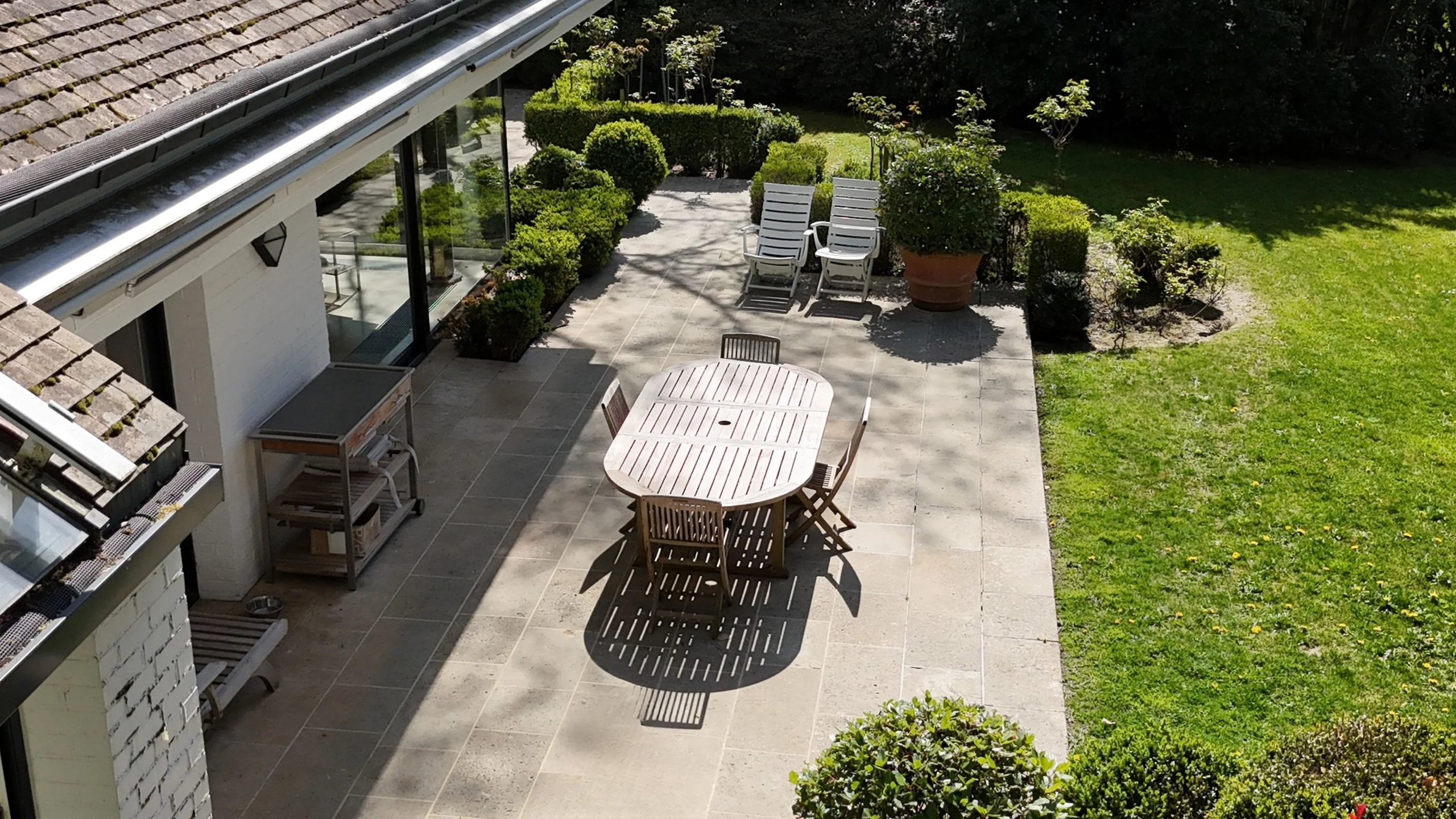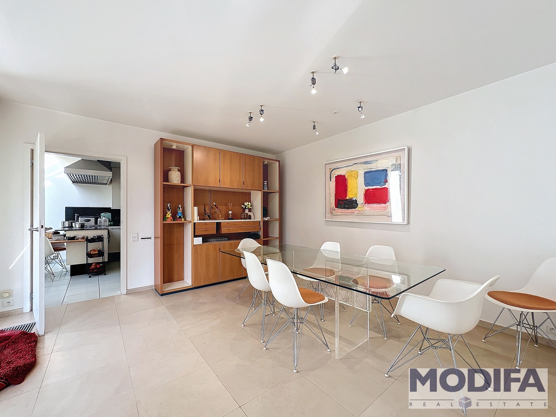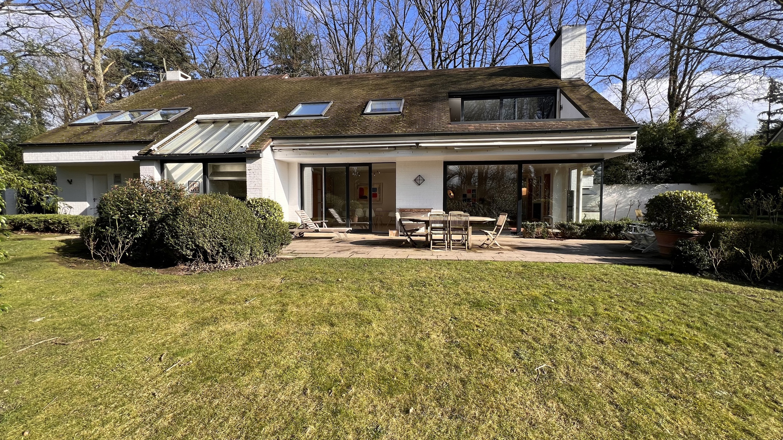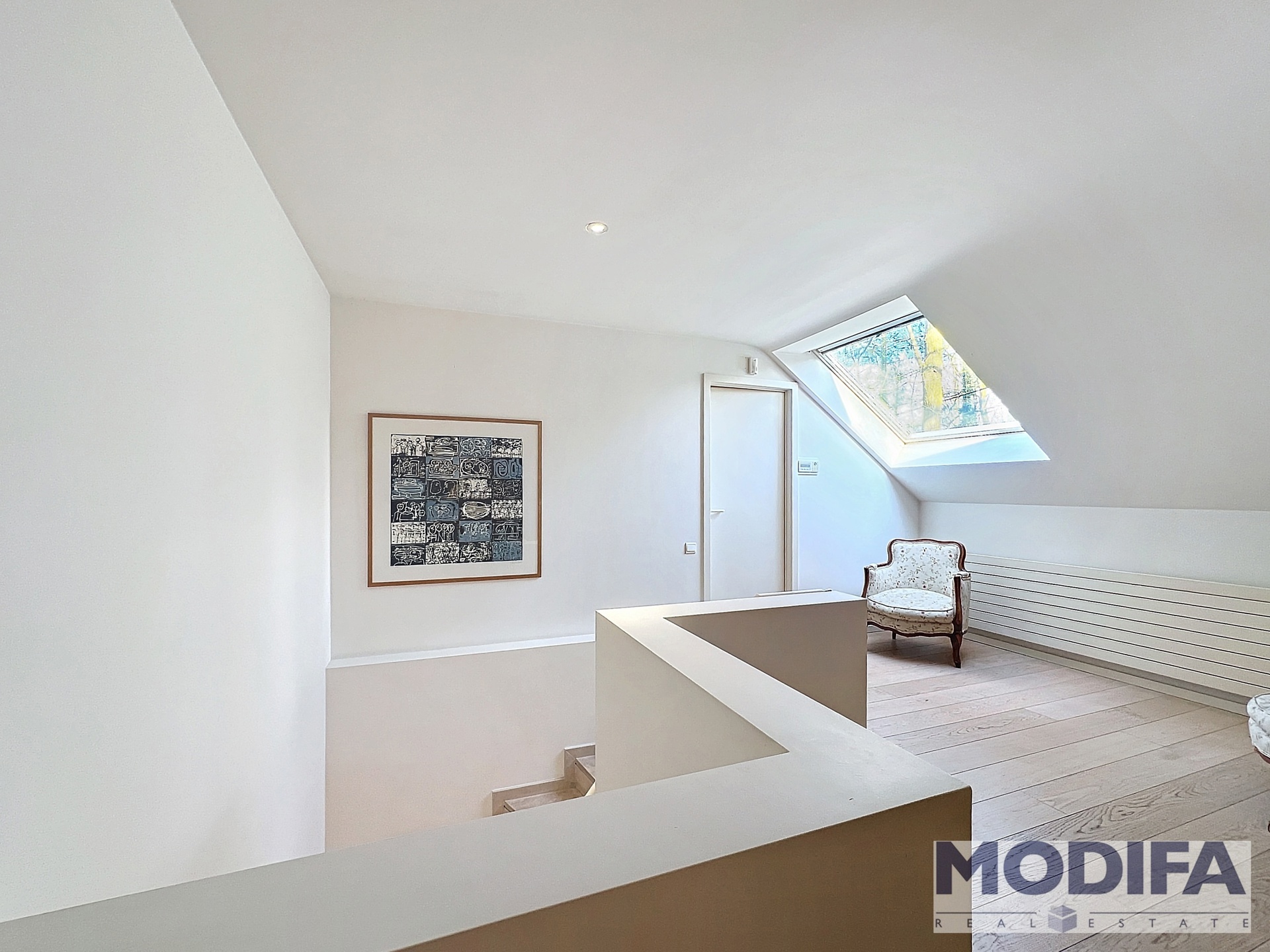 Large hall d'entrée vers confortable séjour en trois parties avec portes coulissantes, cuisine récente hyper-équipée (Granit, électro-ménagers Gaggenau, nombreuses armoires, coin-à-déjeûner), bureau séparé au rez.