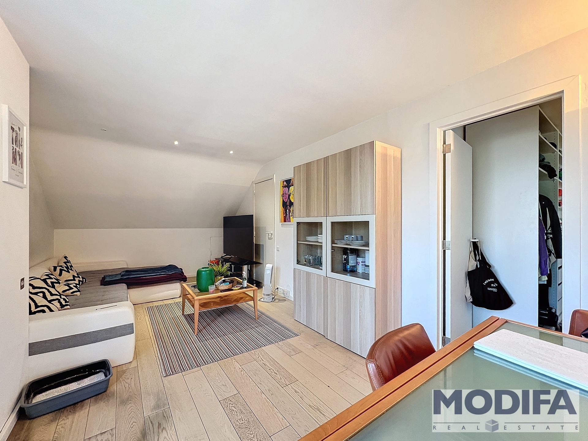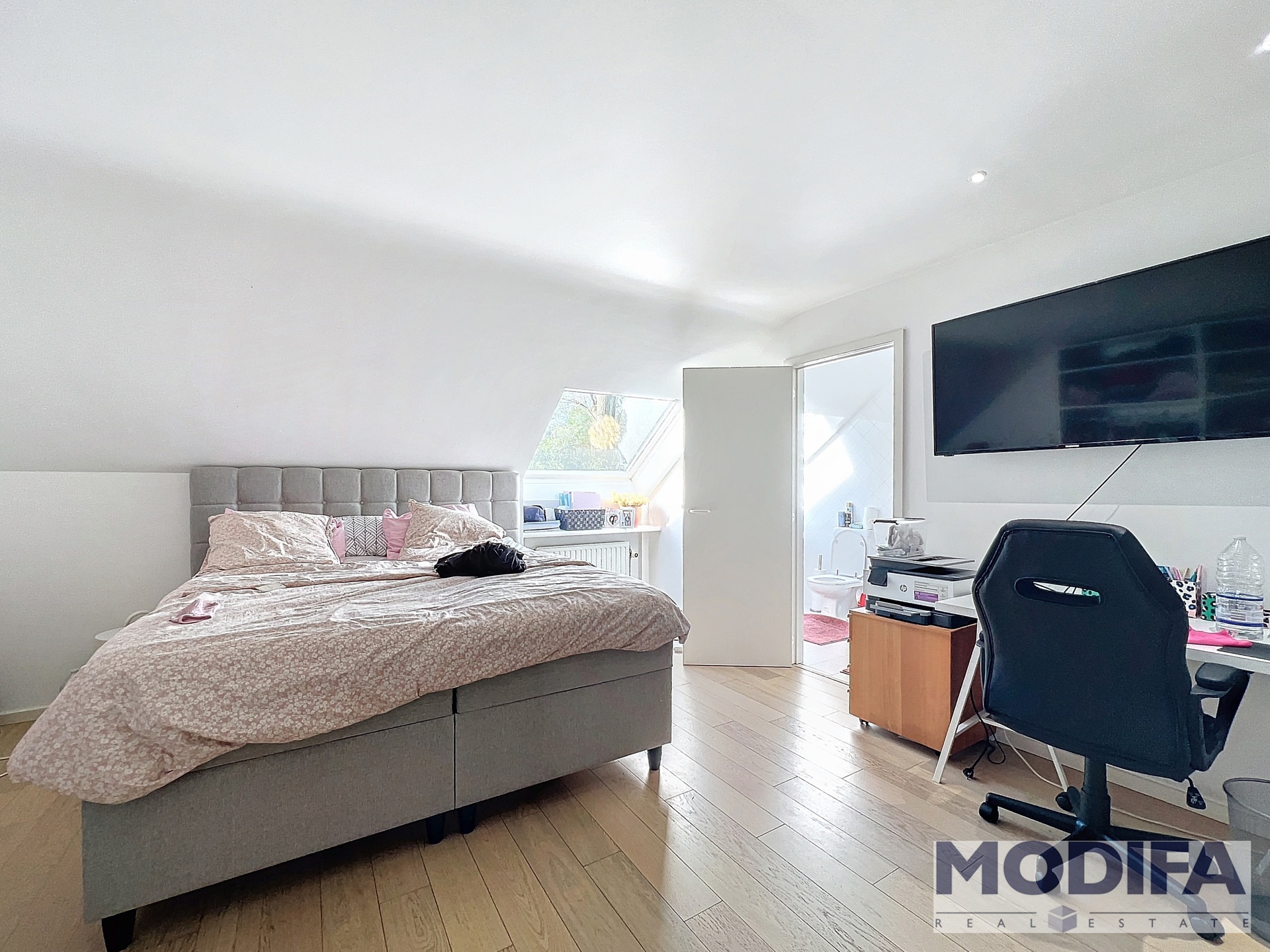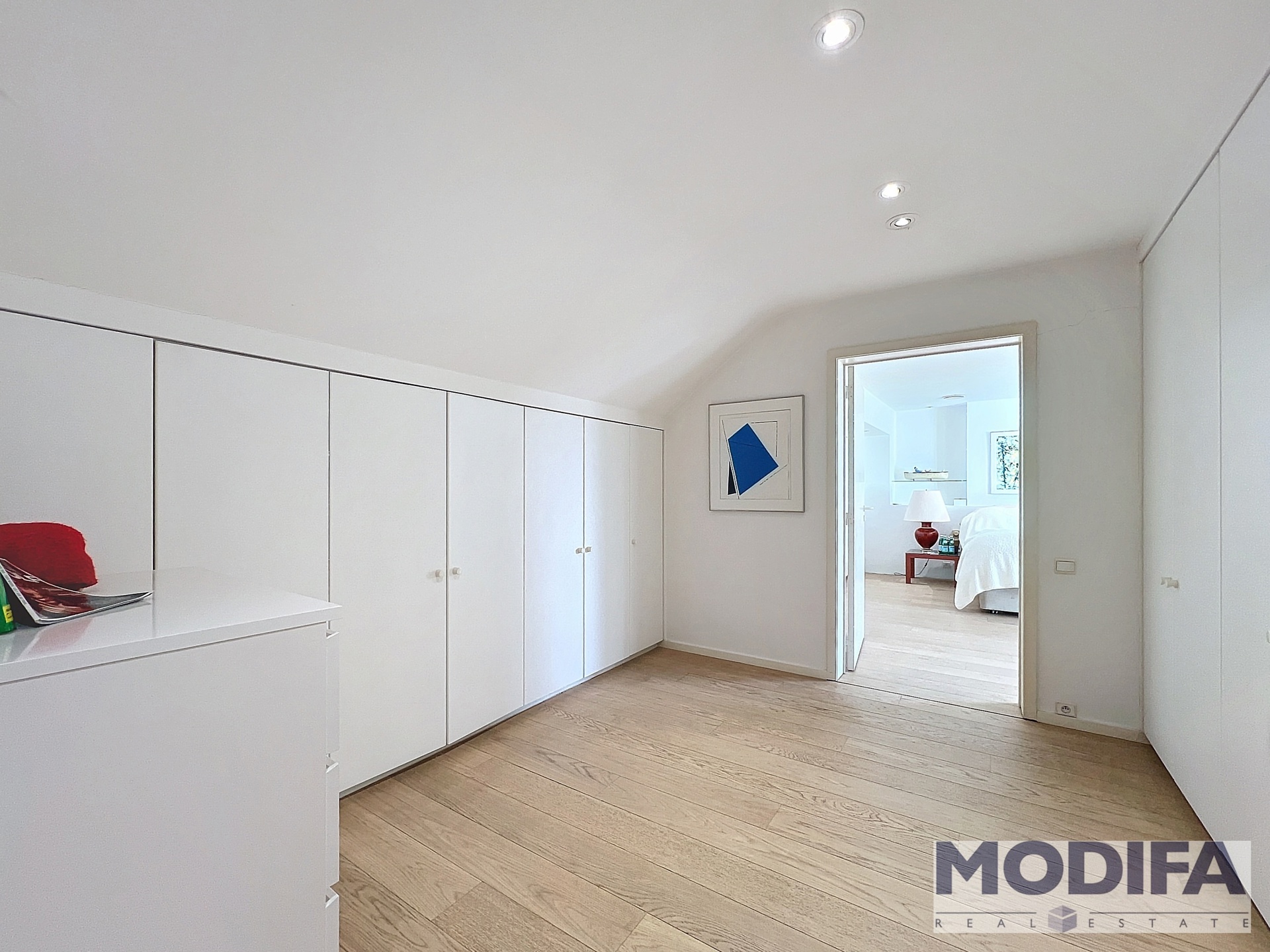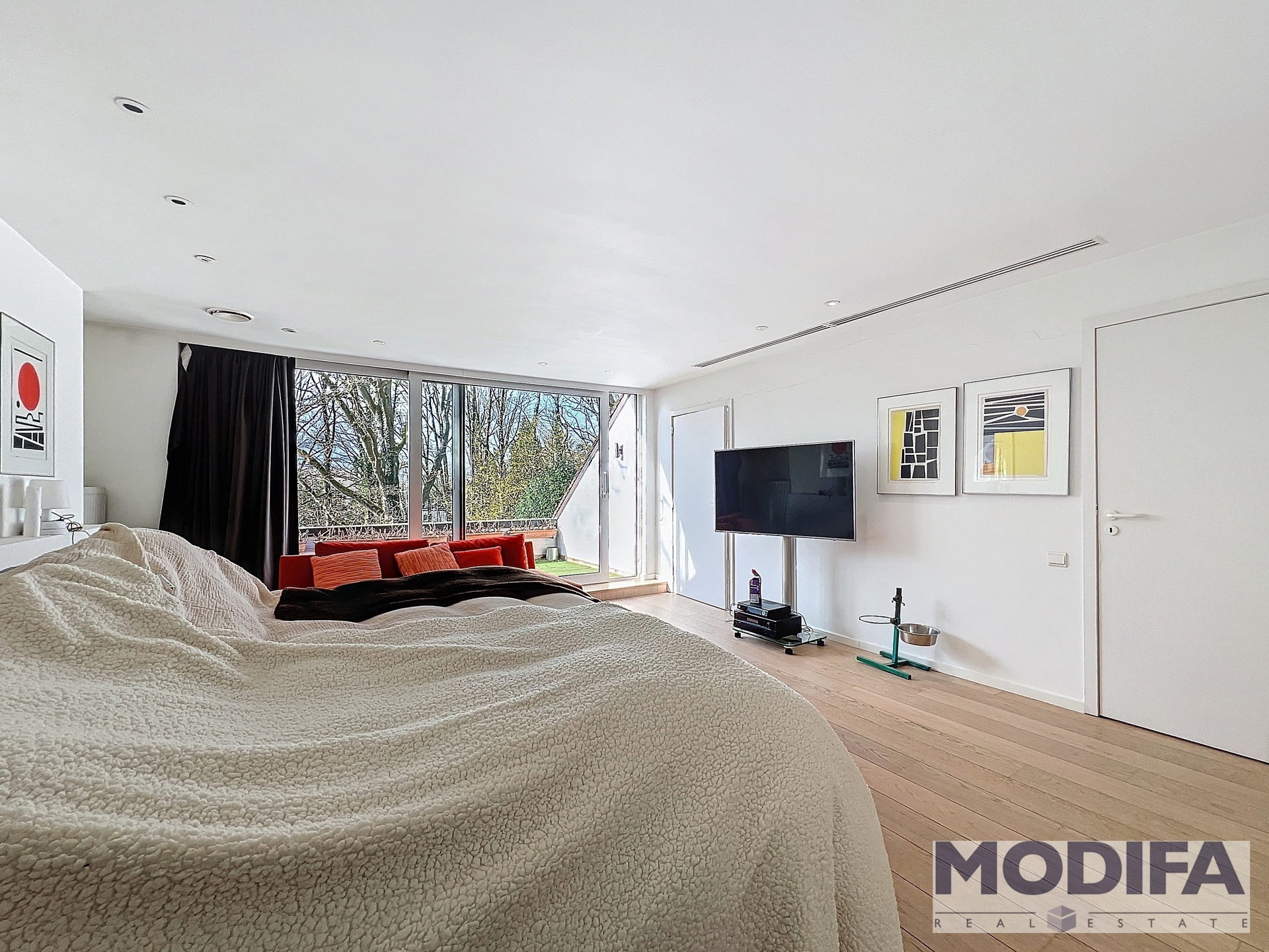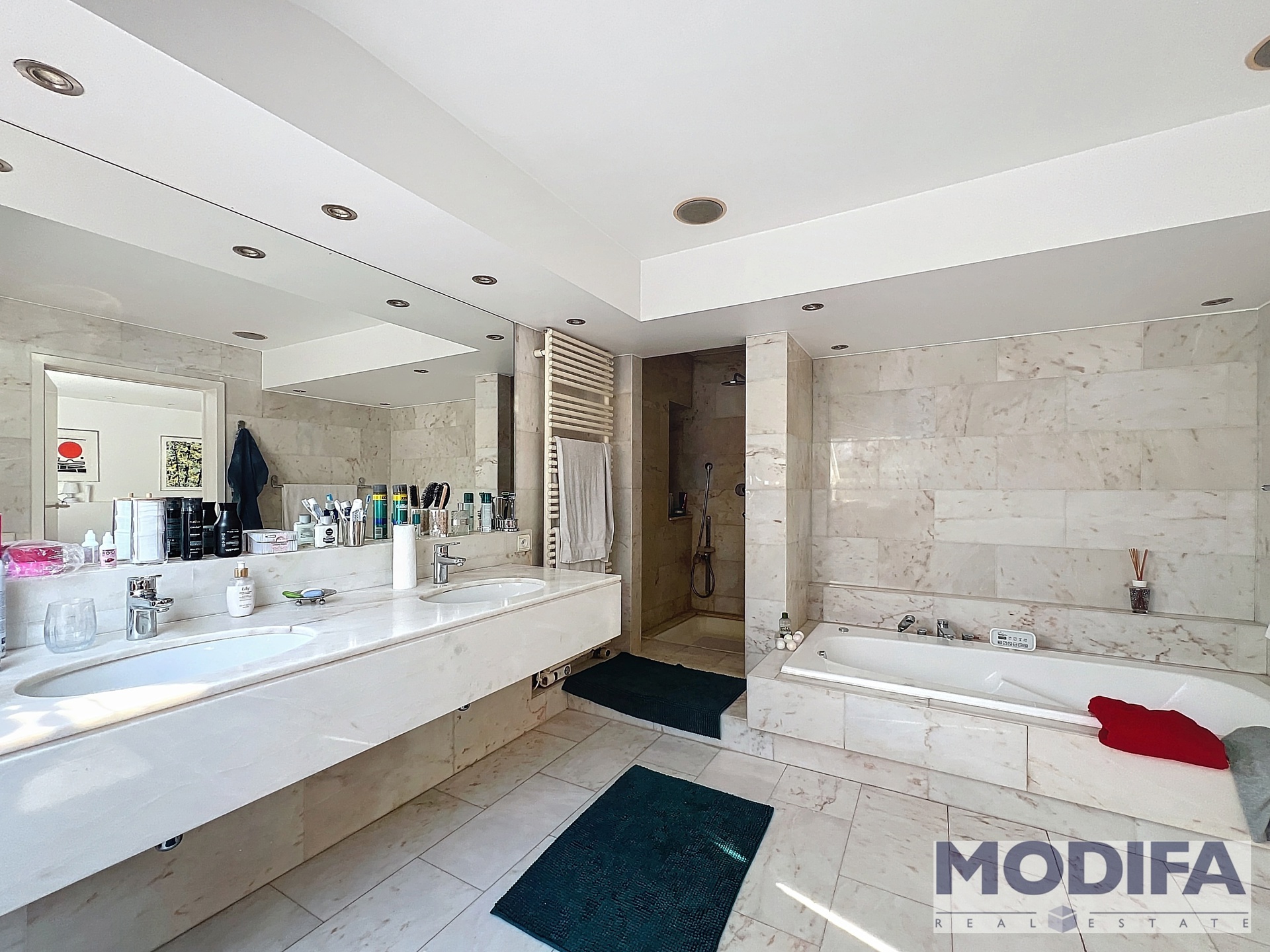 Chambre principale 6m20/5m = 31m², Terrasse +/-10m², dressing équipé d'armories, salle-de-bains (+ double lavabo, baignoire et douche), toilette séparée