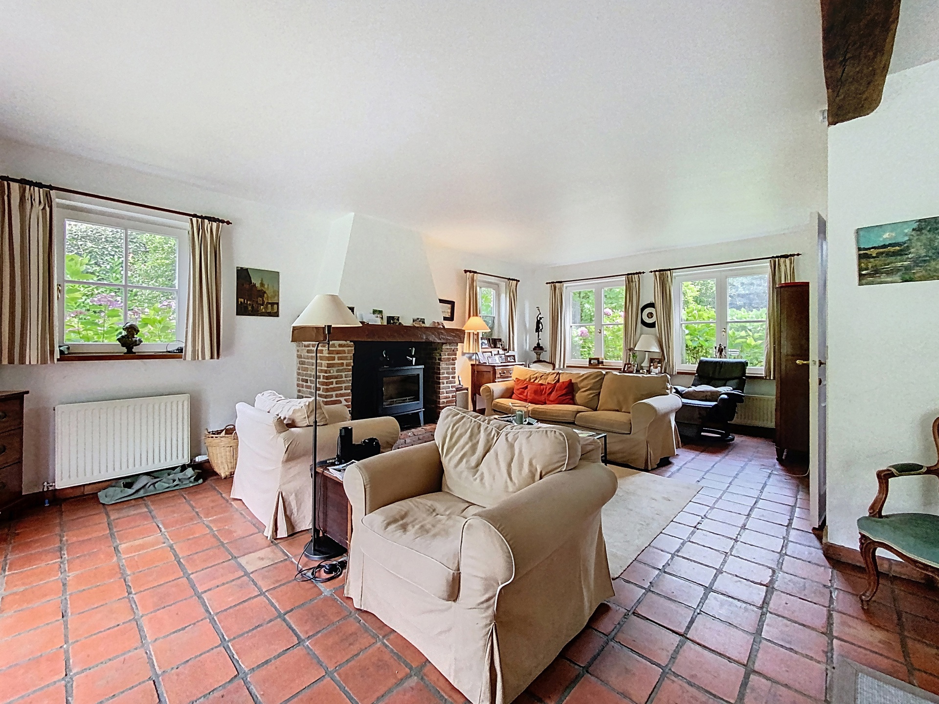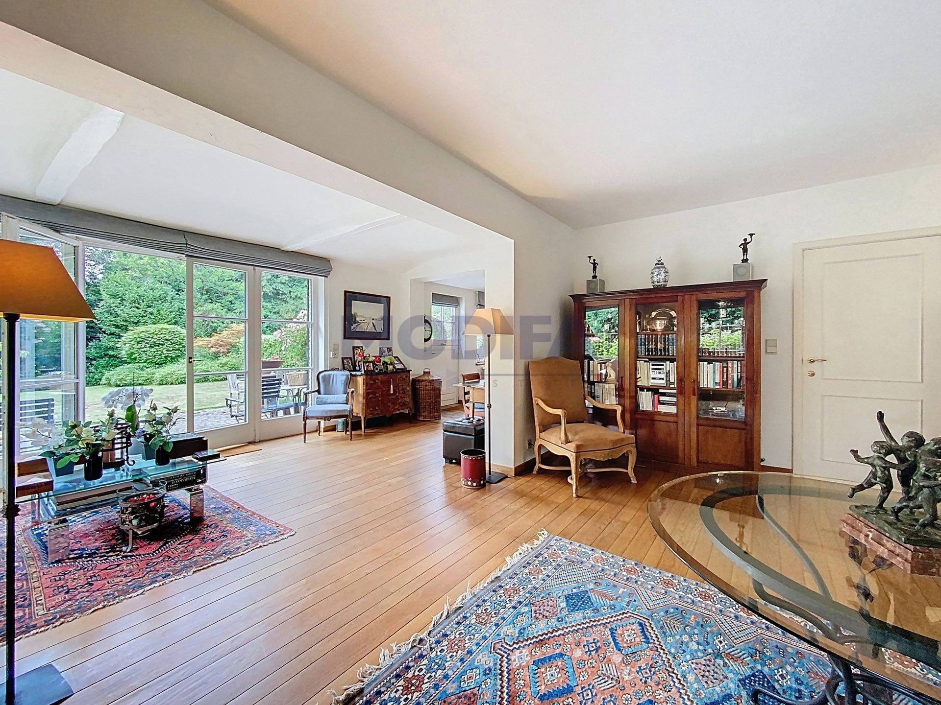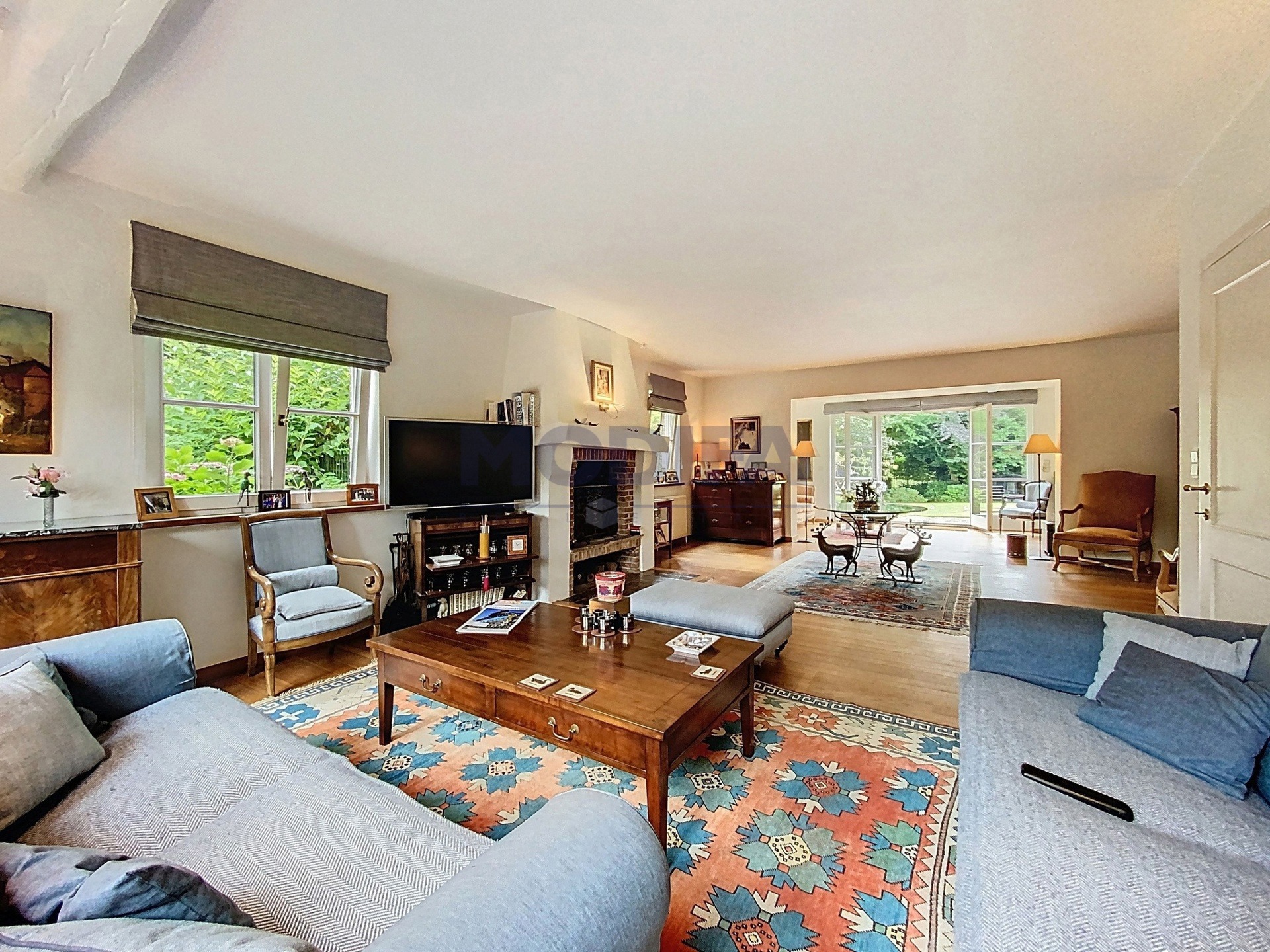 Salon avec feu ouvert (4m25/4m50 + 4m15/6m = 44,1m²), salle-à-manger (3m/5m85 = 17,5m²), plancher en chêne, feu ouvert, accès terrasse et jardin