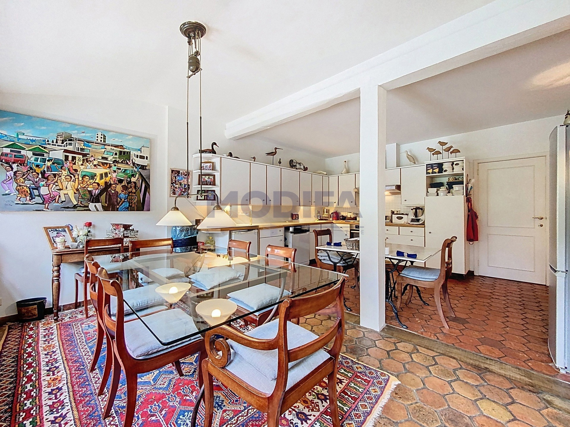 Cuisine équipée avec grand coin à déjeuner (4m55/6m = 27,5m²), tomettes au sol, accès terrasse