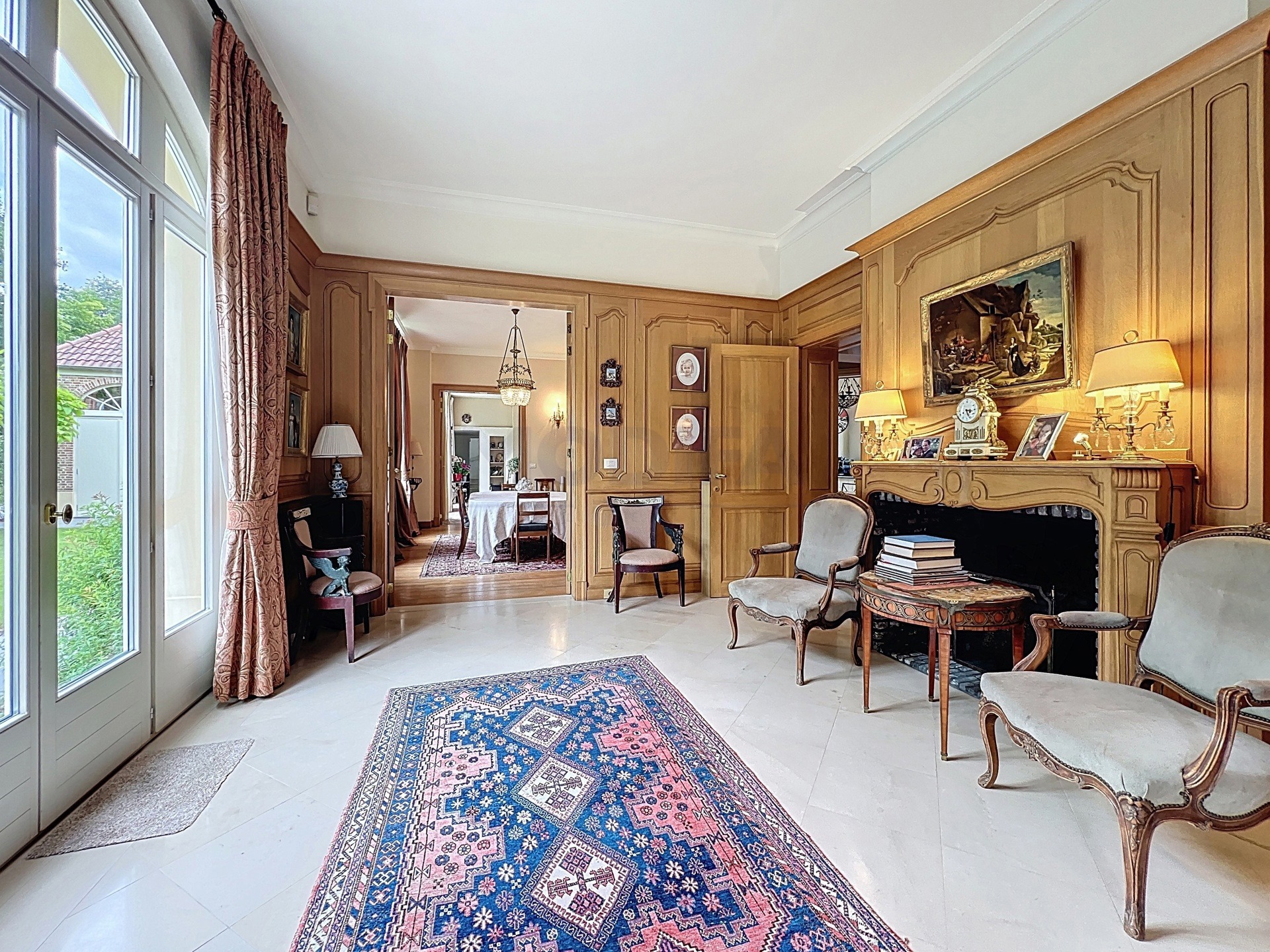 => Salon 9m/5m76 = 52m² feu ouvert (corps de cheminée en marbre de Liège), plafonds moulurés, fenêtre vers le jardin arrière, 4 fenêtres doubles.