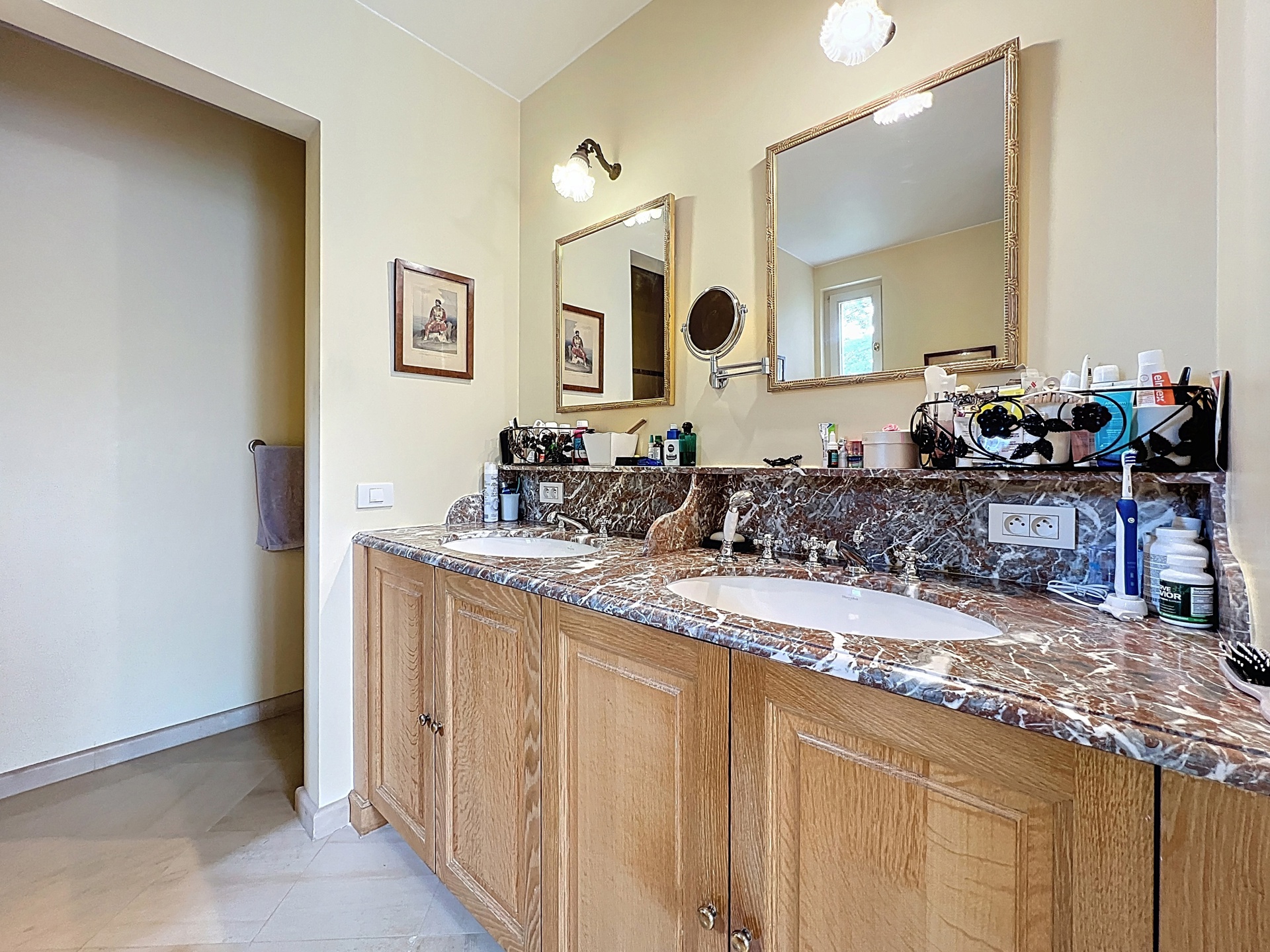 Suite principale : dressing avec armoires/penderies intégrées, chambre principale 5m04/4m24 = 21.4m², Salle-de-bains (4m60/2m95 = 13.6m²) et douche en marbre, 2x lavabos, toilette séparée.