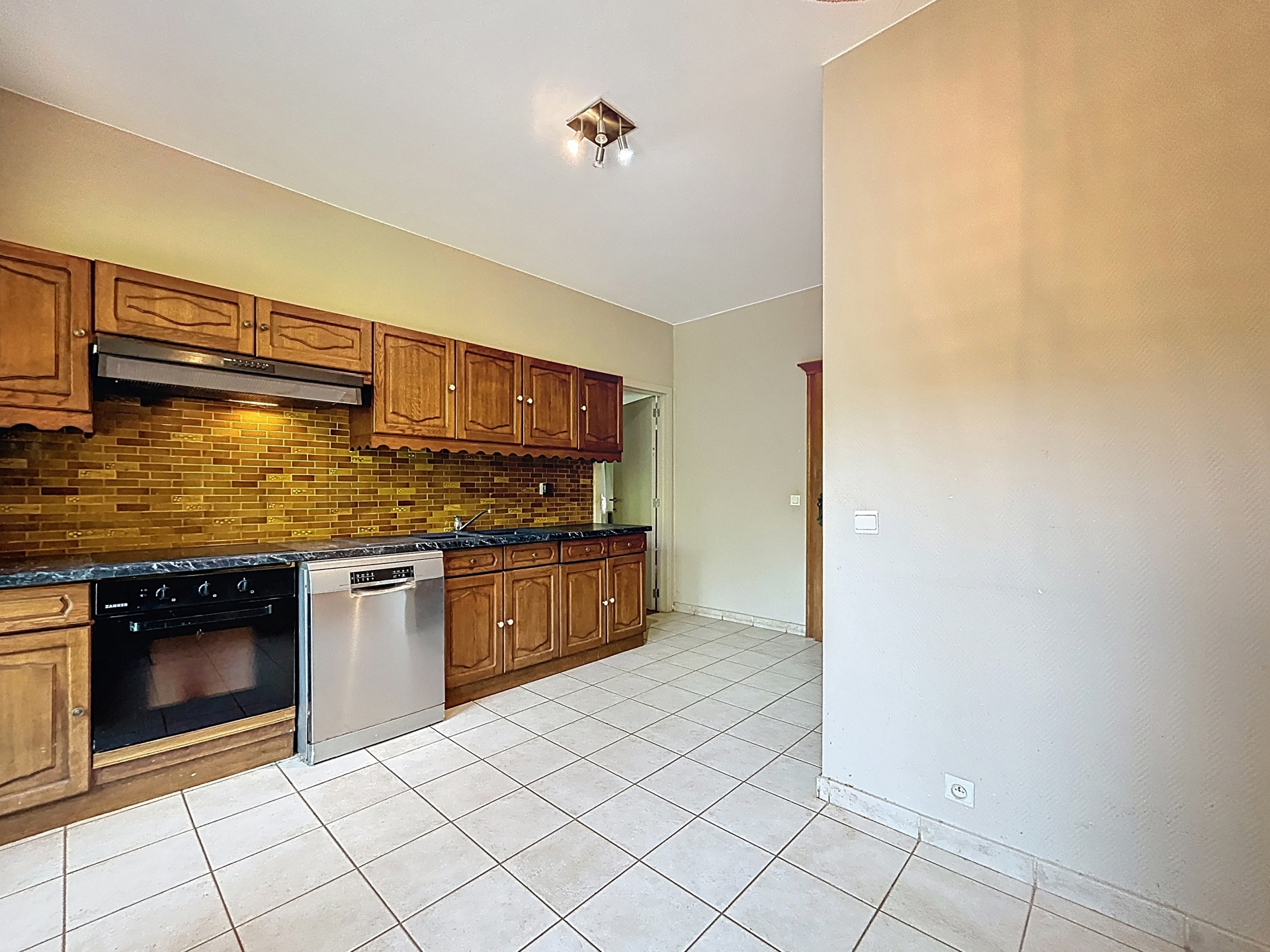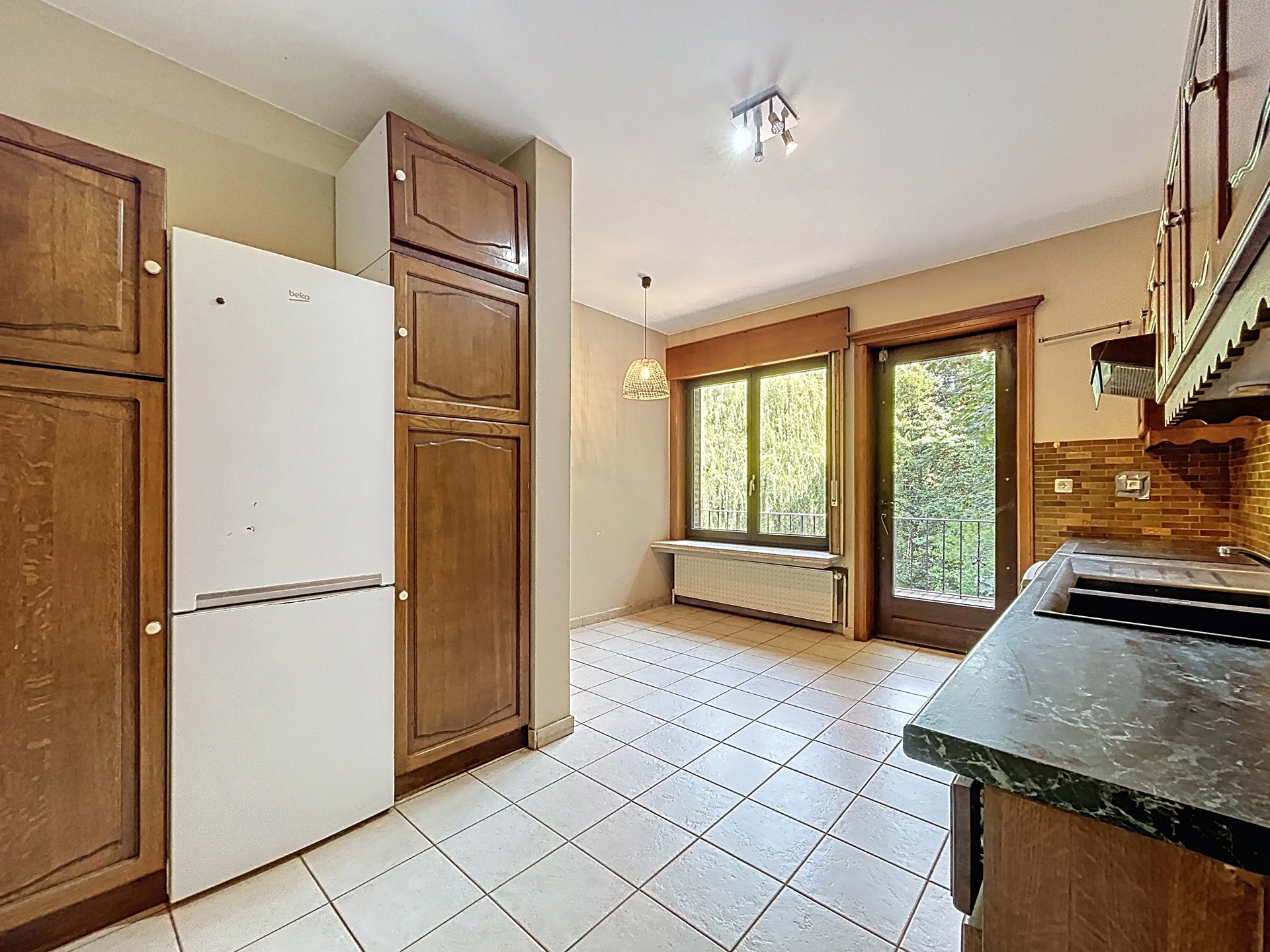 Lichte keuken van 17,7 m² met ontbijthoek en toegang naar buiten. Crèmekleurige tegelvloer.