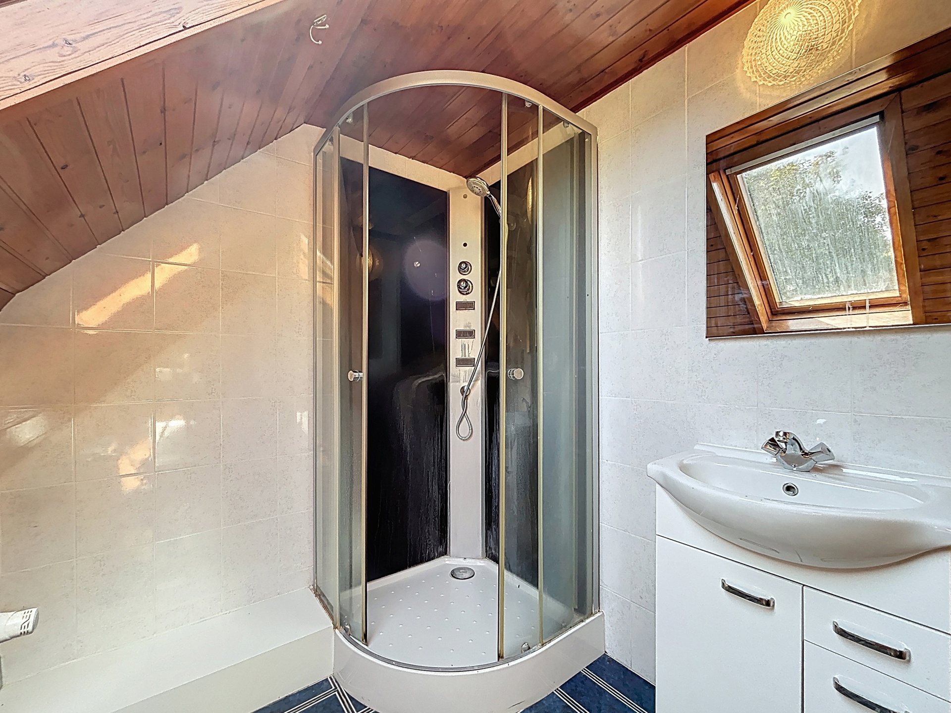 Doucheruimte van 4,9 m² met blauwe tegelvloer, en-suite met slaapkamer 3.