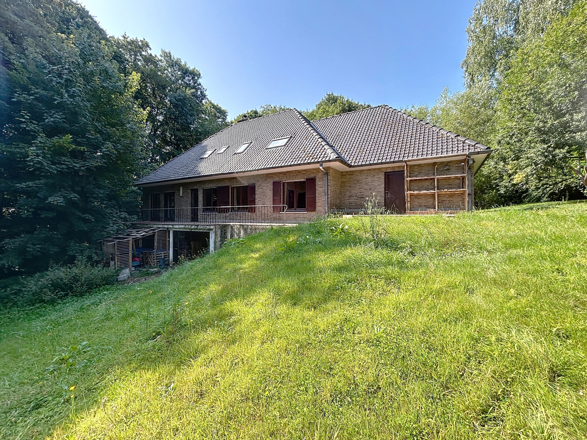 Gelegen in het prachtige domein Angoussart, ruime villa van 370 m² met op het gelijkvloers: inkomhal, woonkamer, keuken met ontbijthoek, 2 slaapkamers, badkamer.