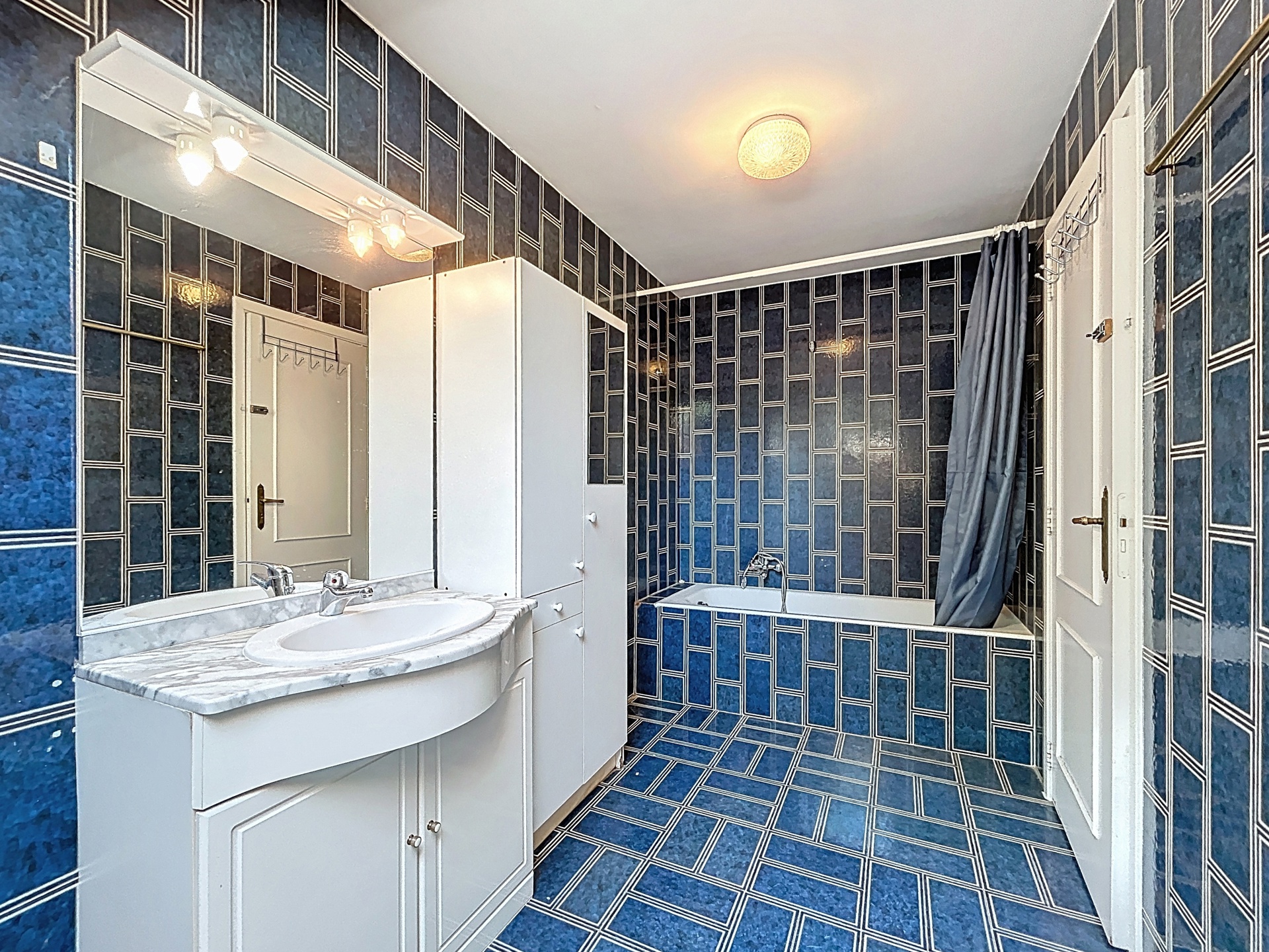 Badkamer van 7,4 m² met blauwe tegelvloer (zelfde als doucheruimte).